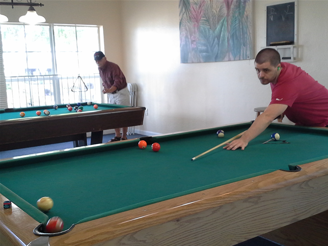 In a separate room within the clubhouse, you’ll find two pool tables and a small ‘rotating’ library, where guests can share their favorite books, games & other media.